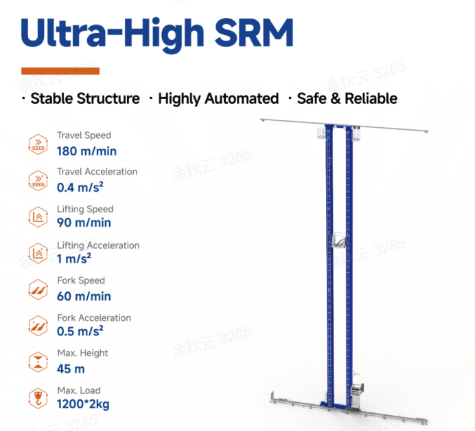 Capability: Max load of 1200 kg x 2. Travel speed 180 m/min; Fork speed 60 m/min.